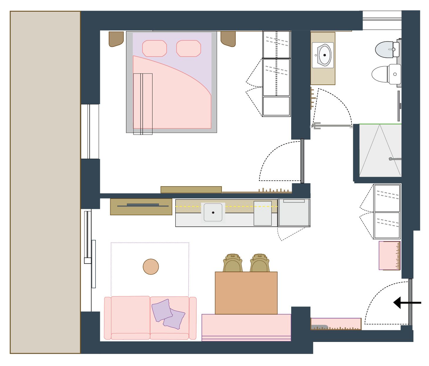Das Ferienapartment besteht aus einem Badezimmer (Dusche, WC und Bidet), einem getrennten Schlafzimmer mit Doppelbett und einer offenen Wohnküche, bei der sich Wohnzimmer, Essbereich und Küche einen Raum teilen.