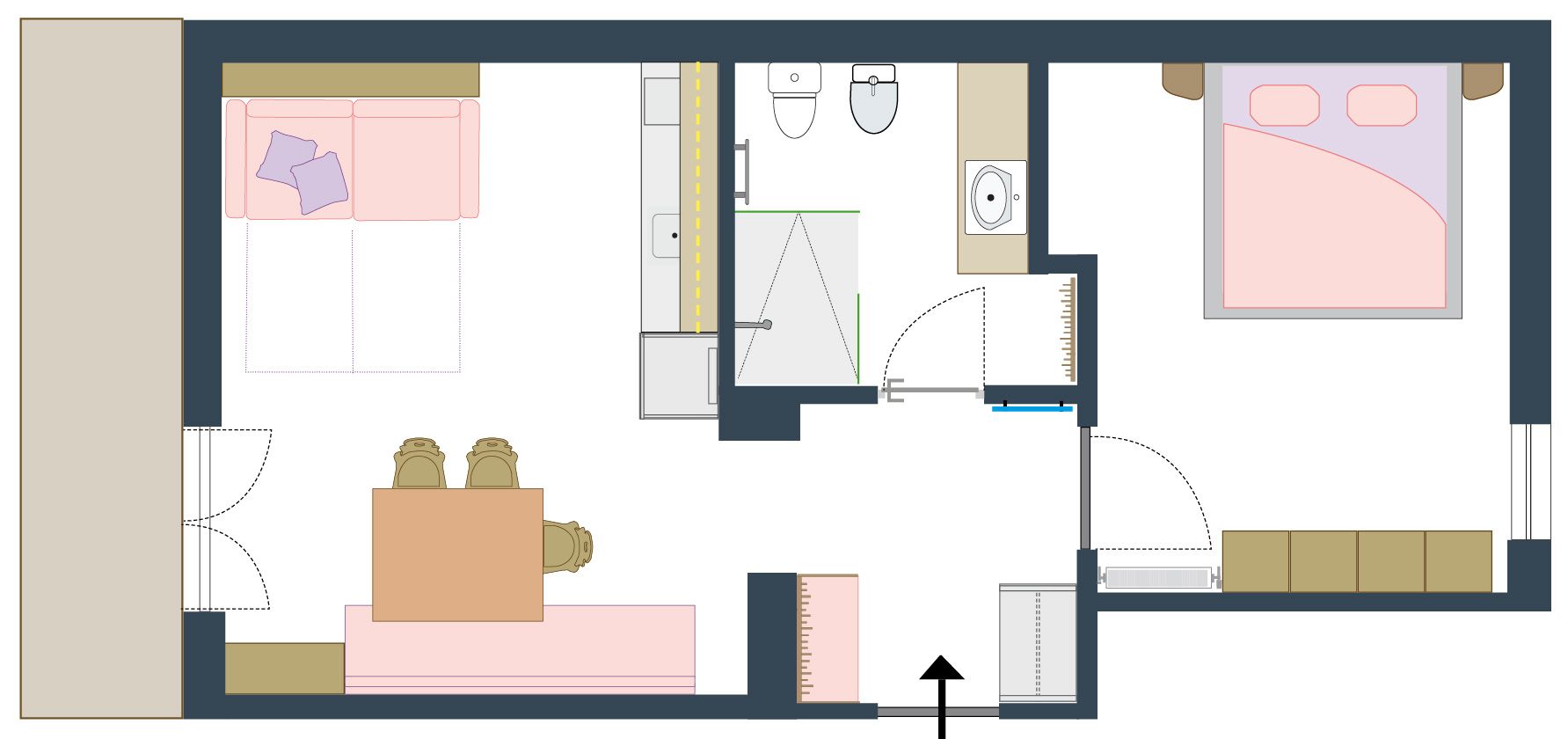 Die Ferienwohnung besteht aus einem Badezimmer (Dusche, WC und Bidet), einem getrennten Schlafzimmer mit Doppelbett und einer offenen Wohnküche, bei der sich Wohnzimmer, Essbereich und Küche einen Raum teilen.
