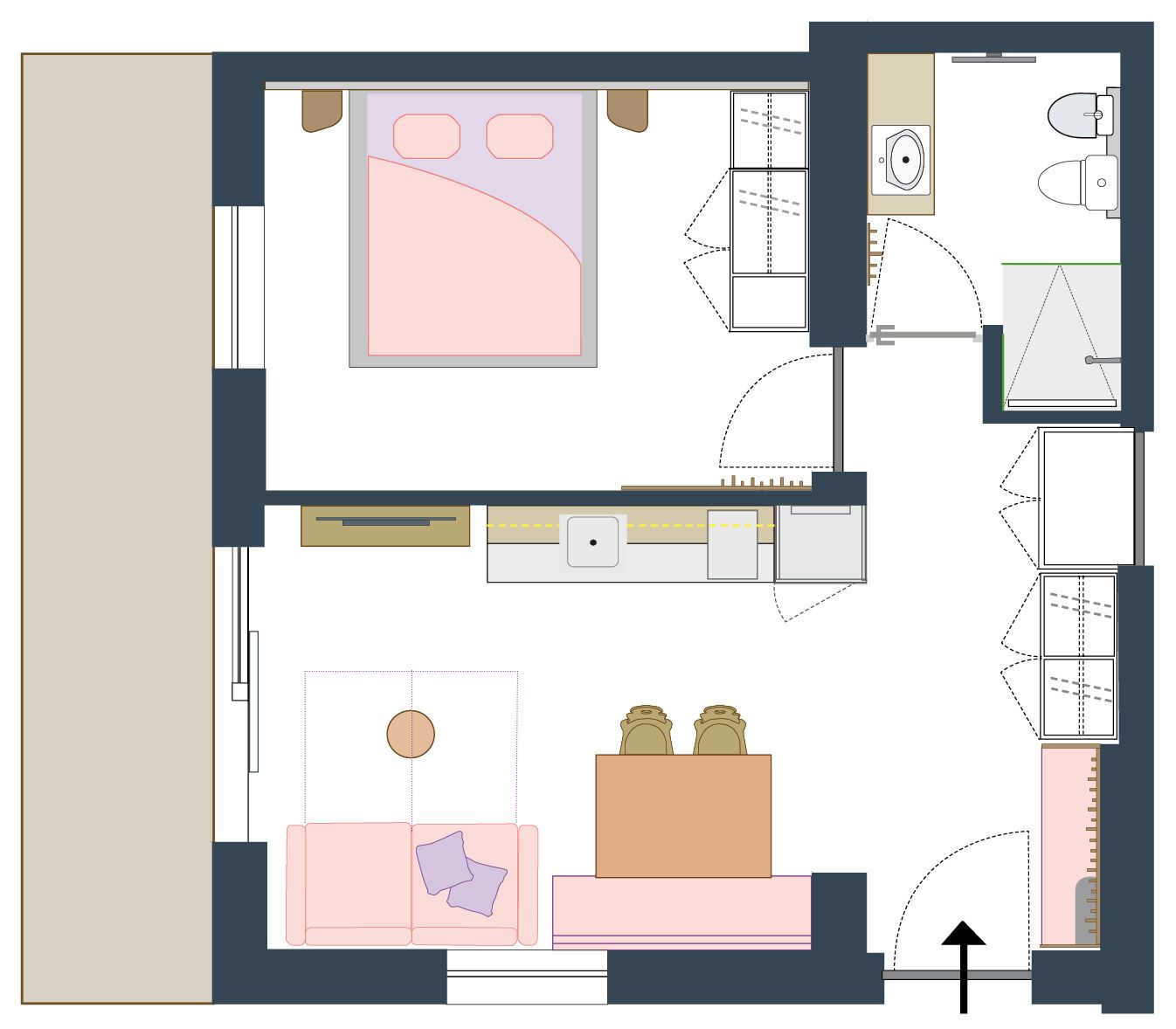 Die Ferienwohnung besteht aus einem Badezimmer (Dusche, WC und Bidet), einem getrennten Schlafzimmer mit Doppelbett und einer offenen Wohnküche, bei der sich Wohnzimmer, Essbereich und Küche einen Raum teilen.